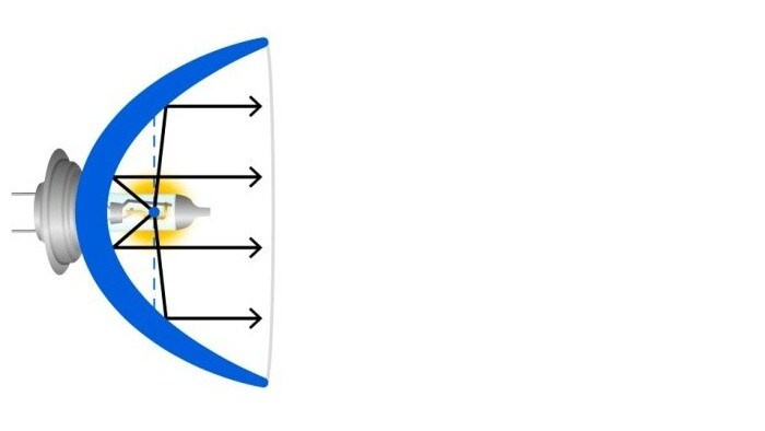 Hình 1: Hình dạng bóng đèn tốt, với dây tóc nằm ở tiêu điểm chính xác của đèn pha Hình ảnh cho thấy sơ đồ đơn giản về đường đi của chùm sáng đèn pha có chóa đèn hình parabol. Các chùm sáng chỉ phát ra song song nếu dây tóc nằm ở tiêu điểm chính xác. Đương nhiên, các nhà sản xuất có thương hiệu cũng cung cấp thiết bị gốc như Philips sẽ sản xuất các bóng đèn đáp ứng yêu cầu nghiêm ngặt của ECE R37 và thông số kỹ thuật nội bộ của họ thông thường còn nghiêm ngặt hơn. Điều này đòi hỏi quy trình sản xuất có độ chính xác cao và kiểm tra đảm bảo chất lượng cực kỳ nghiêm ngặt. Các thử nghiệm so sánh do các tạp chí xe hơi thực hiện đã chứng minh nhiều lần rằng nhiều bóng đèn được sản xuất bằng kỹ thuật sản xuất rẻ tiền không đáp ứng được các tiêu chuẩn cao này, trong đó sai số về hình dạng là vấn đề chính. Kết quả là chùm sáng không chính xác, phạm vi quá ngắn hoặc gây chói mắt (được minh họa trong hai hình ảnh sử dụng chóa đèn hình parabol). Nếu dây tóc quá xa chóa đèn, chùm sáng sẽ quá ngắn; nếu dây tóc quá gần sẽ gây chói mắt.