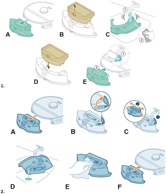 - Nhấn nút tháo trên ngăn chứa nước và trượt ngăn chứa nước ra khỏi robot (xem hình 2A).