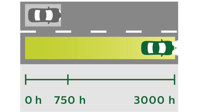 *So với tiêu chuẩn pháp lý tối thiểu ECE **Lên đến ***Tuổi thọ khác nhau cho mỗi loại, chỉ dành cho H7 ****Tuổi thọ khác nhau cho mỗi loại, chỉ dành cho H4